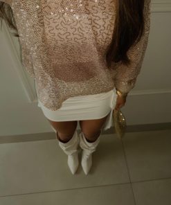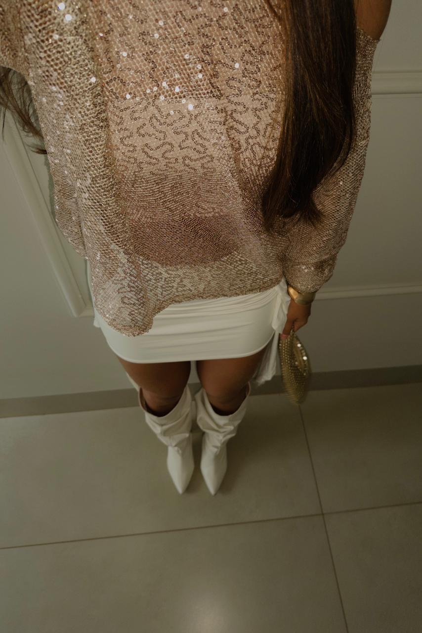 Blusa com bordado em paetê dourado, punho duplo e gola ampla que permite caimento nos ombros.