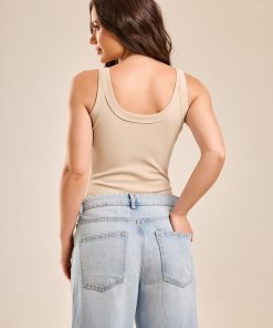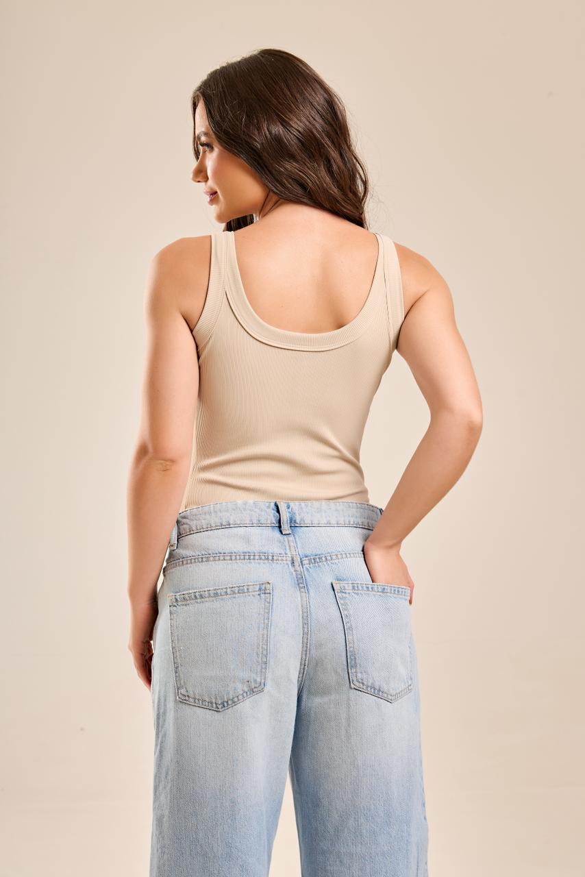 Body em ribana canelada de poliamida, com forro em toda parte frontal e fecho de pressão.