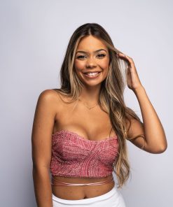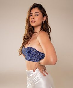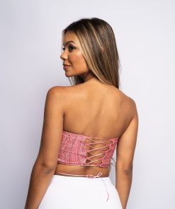 Nas costas possui um fio de cetim para trançar e ajustar ao corpo